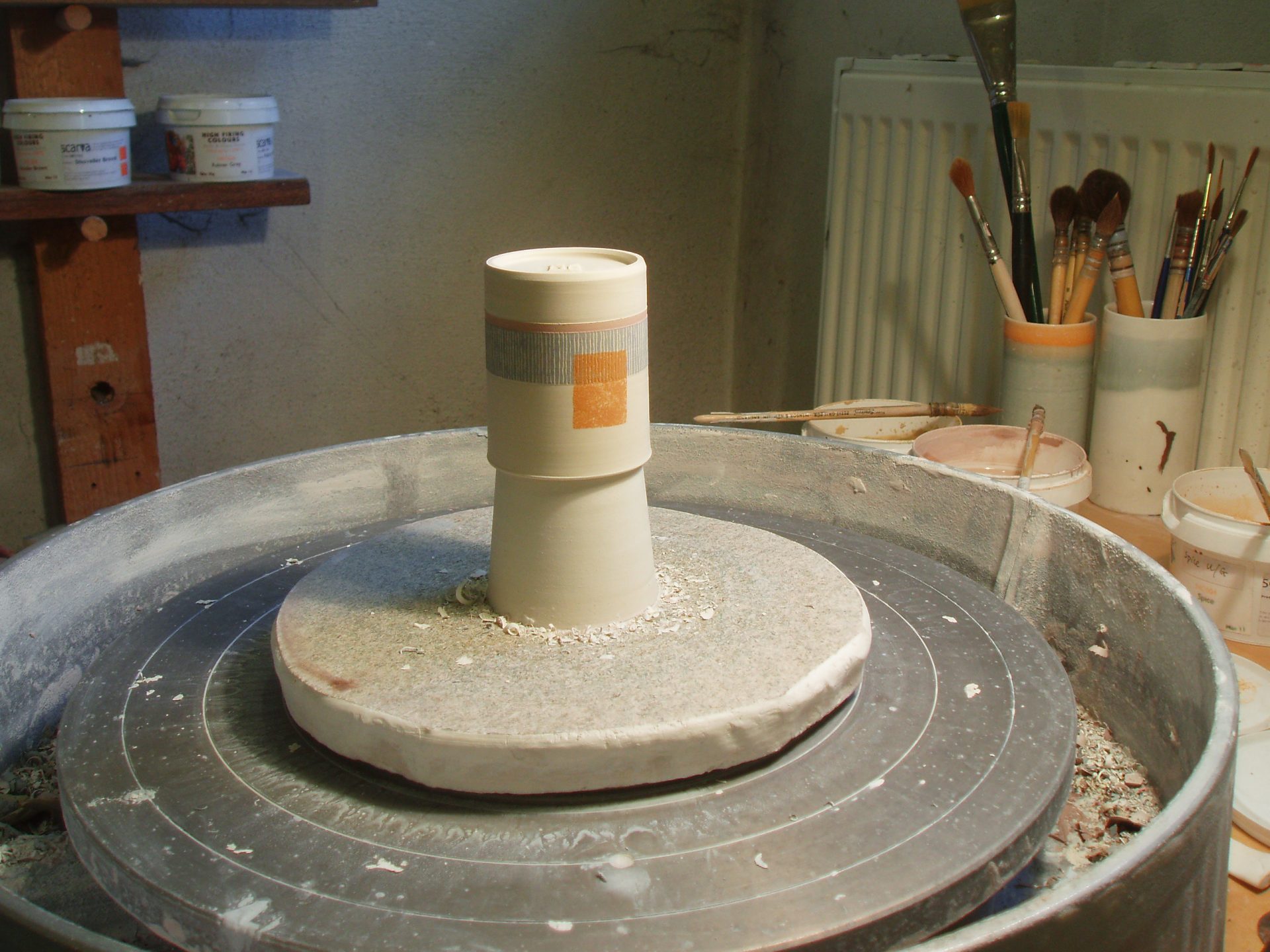 espresso james and tilla waters thrown porcelainI couldn’t resist taking an image of this espresso mug body, upside down on a chuck on Tilla’s wheel. I think they look particularly lovely at this stage – absolutely matt, fresh and direct.