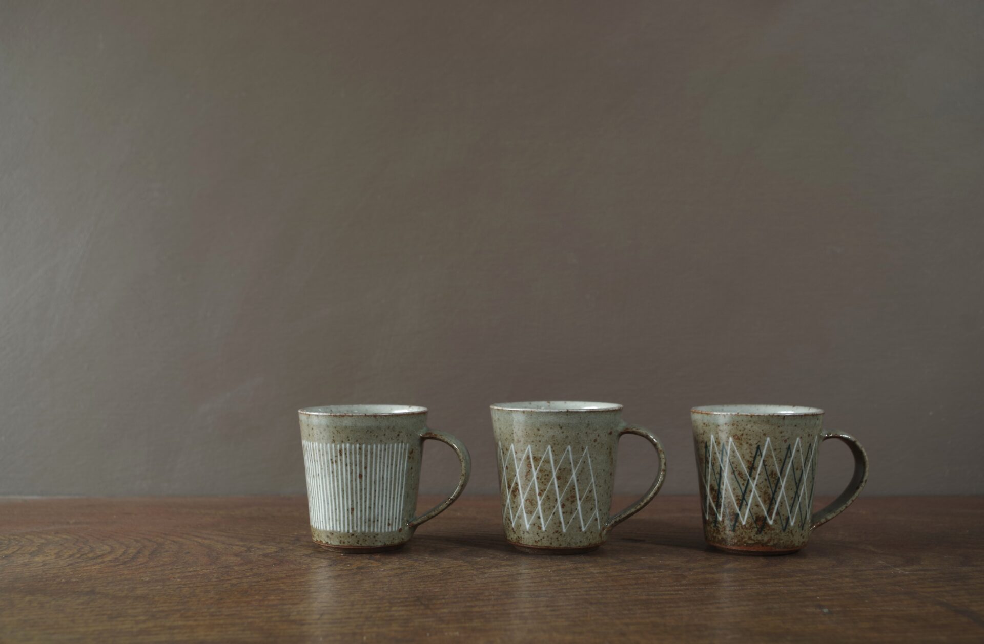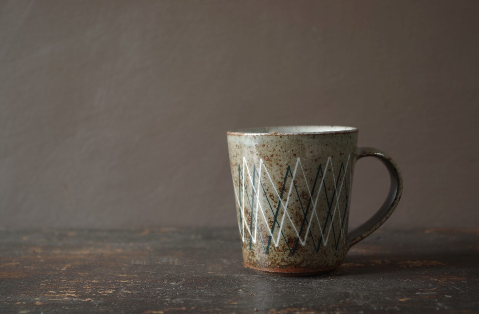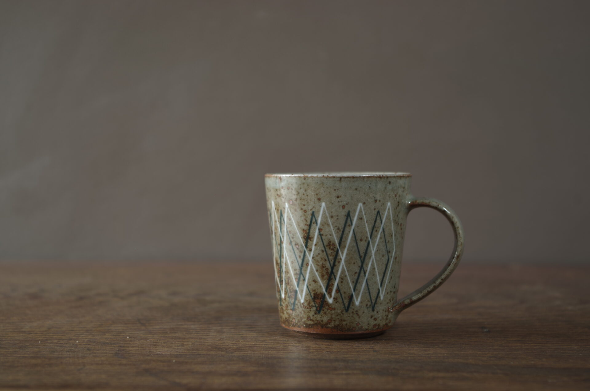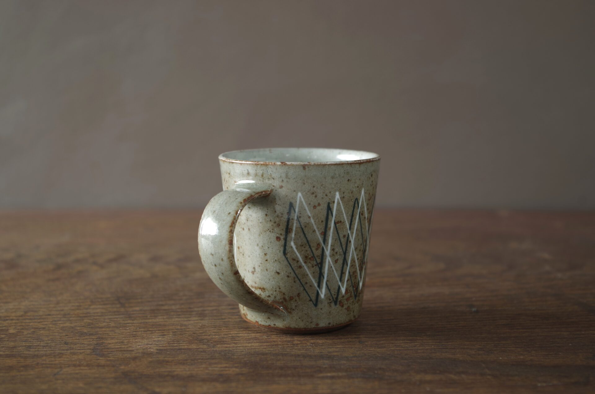Thrown, reduction fired stoneware cup with pulled handle. inlaid decoration.