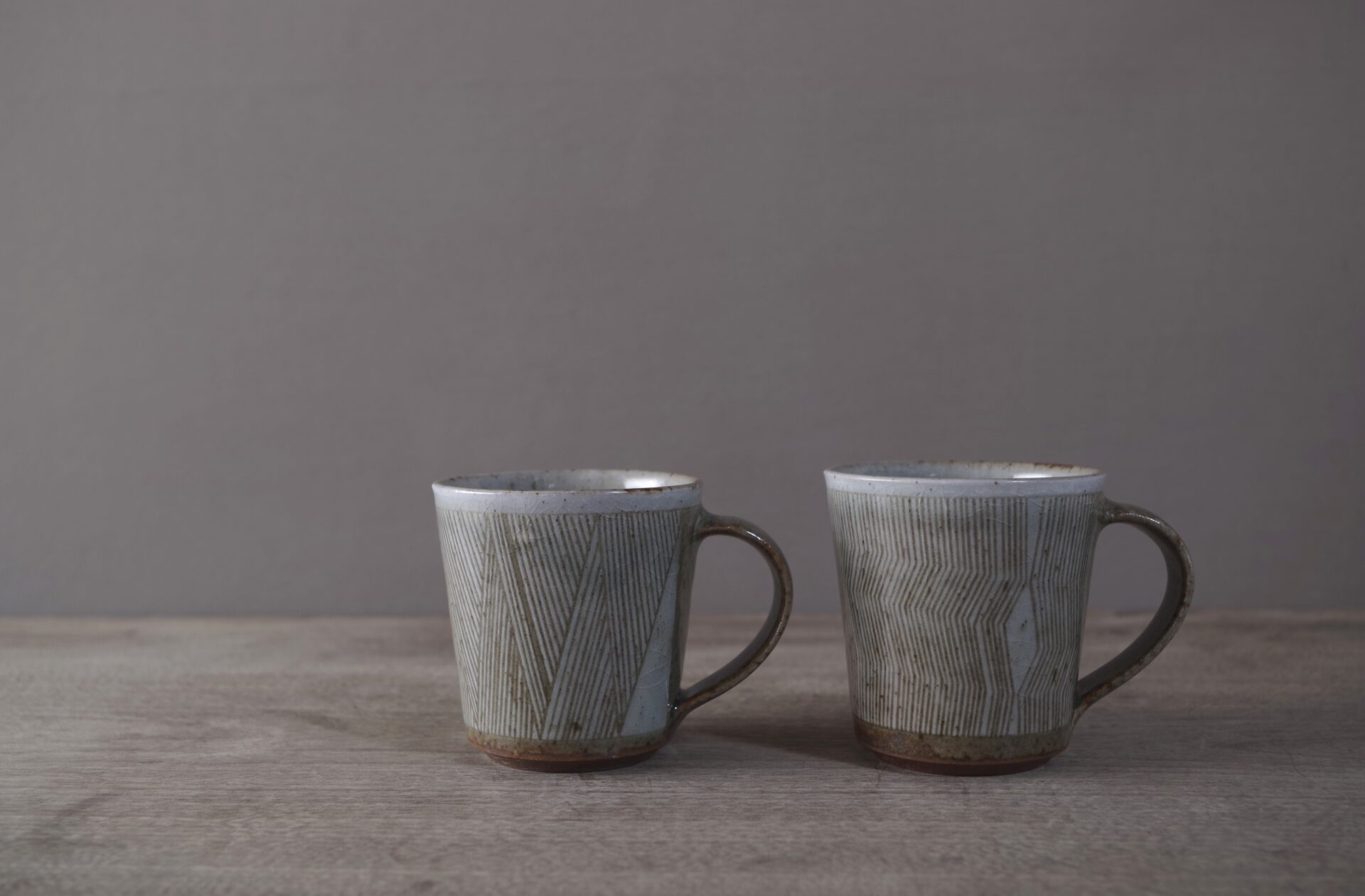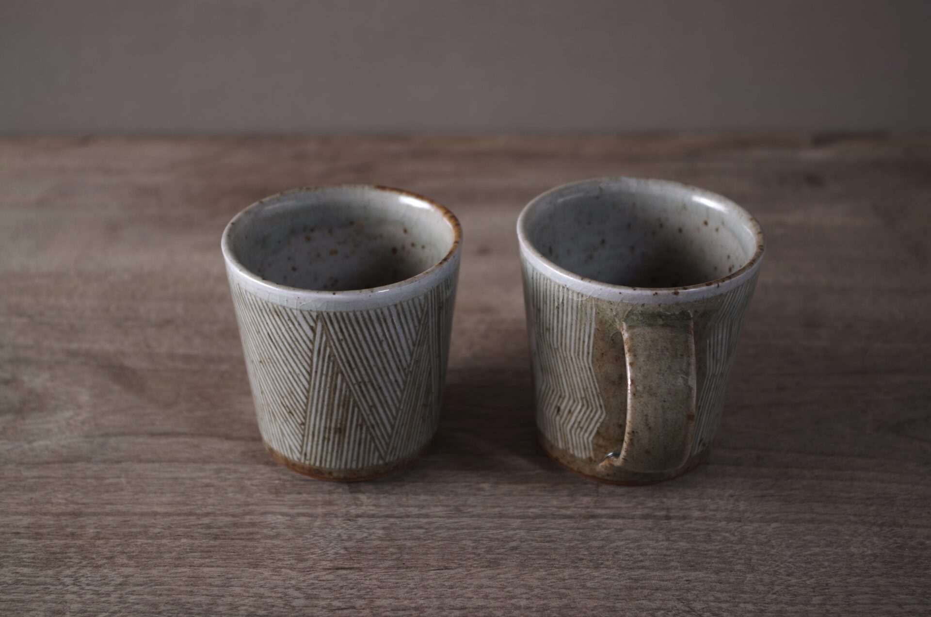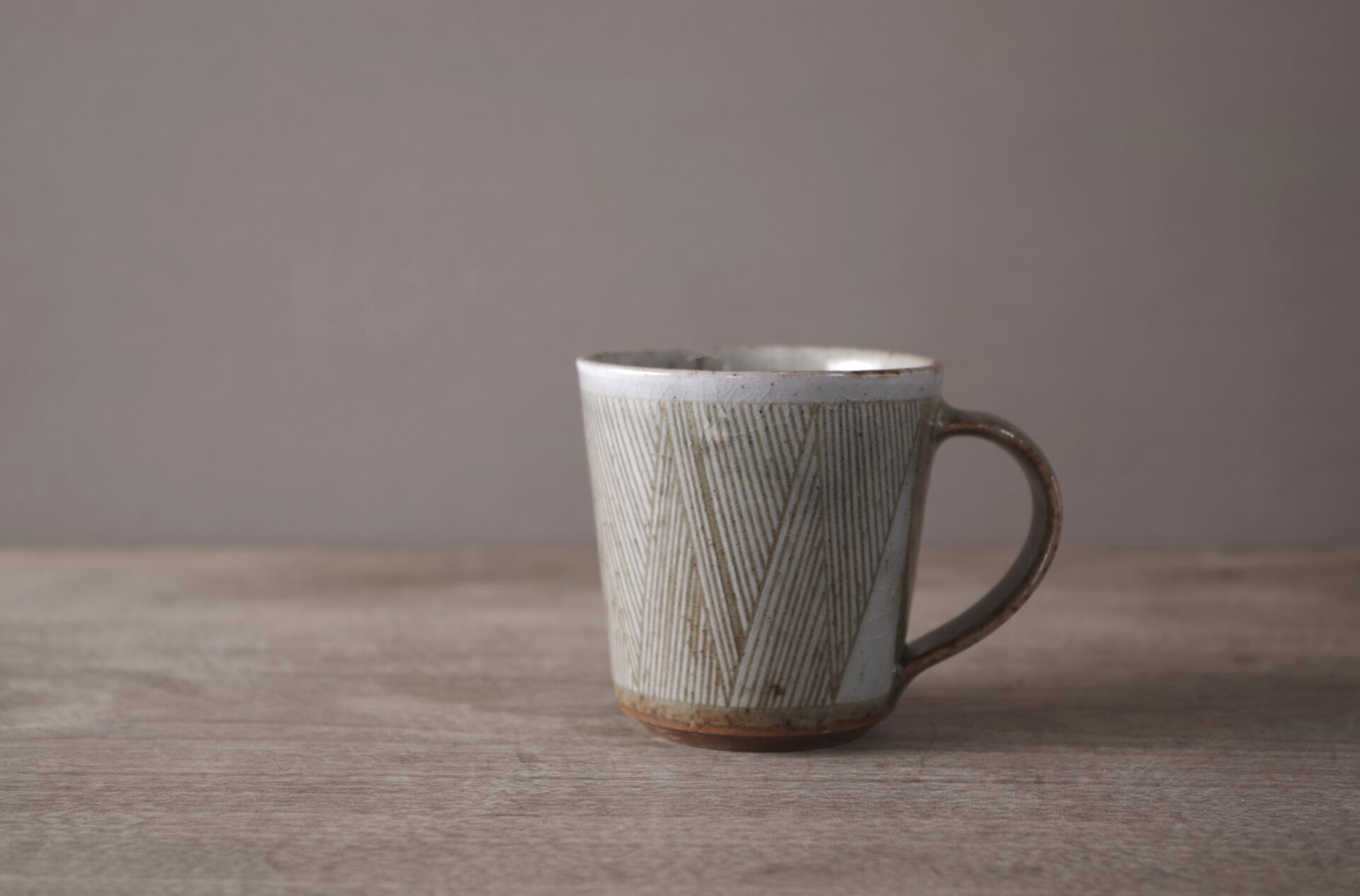Thrown, reduction fired stoneware cup with pulled handle. Sgraffito decoration.