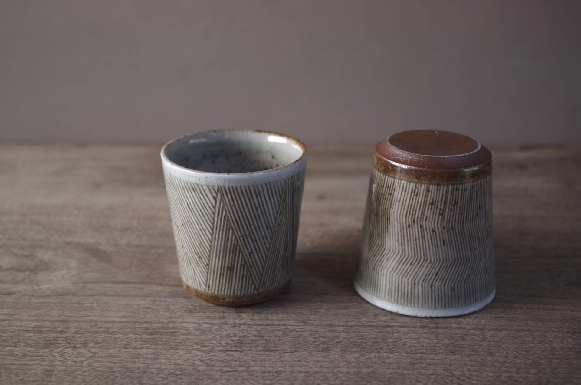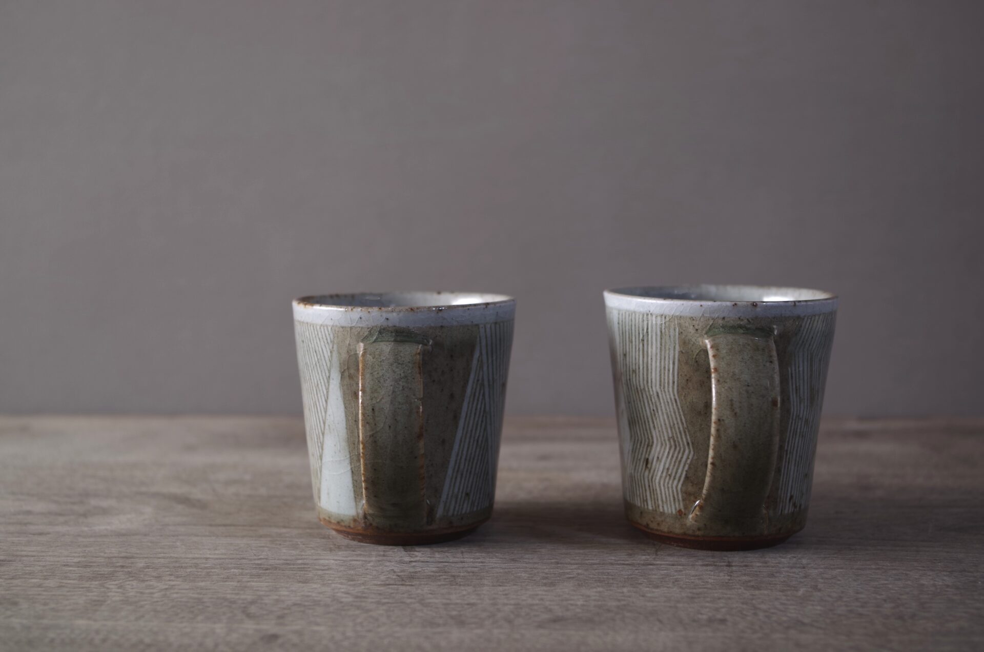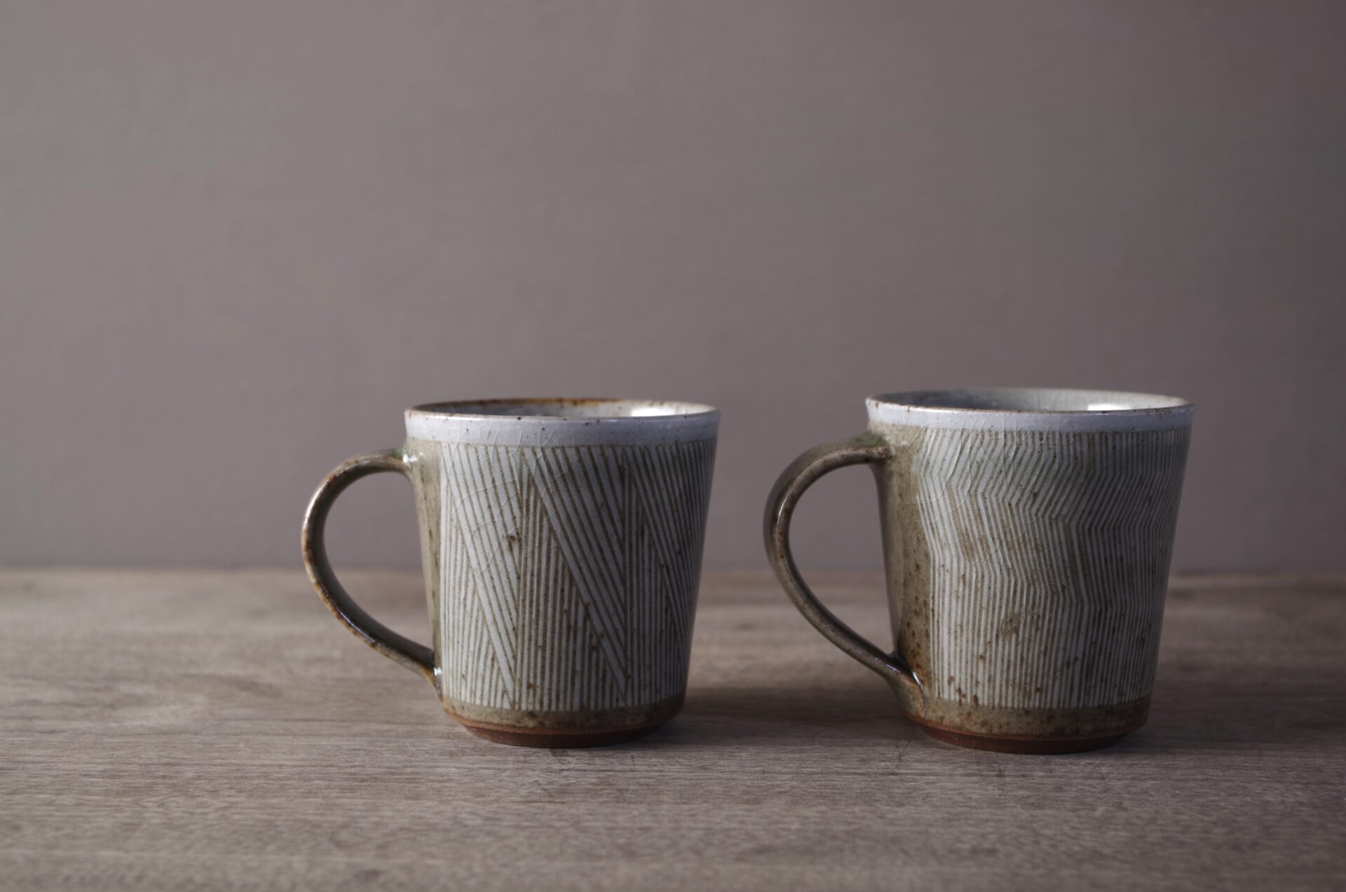 Thrown, reduction fired stoneware cup with pulled handle. Sgraffito decoration.