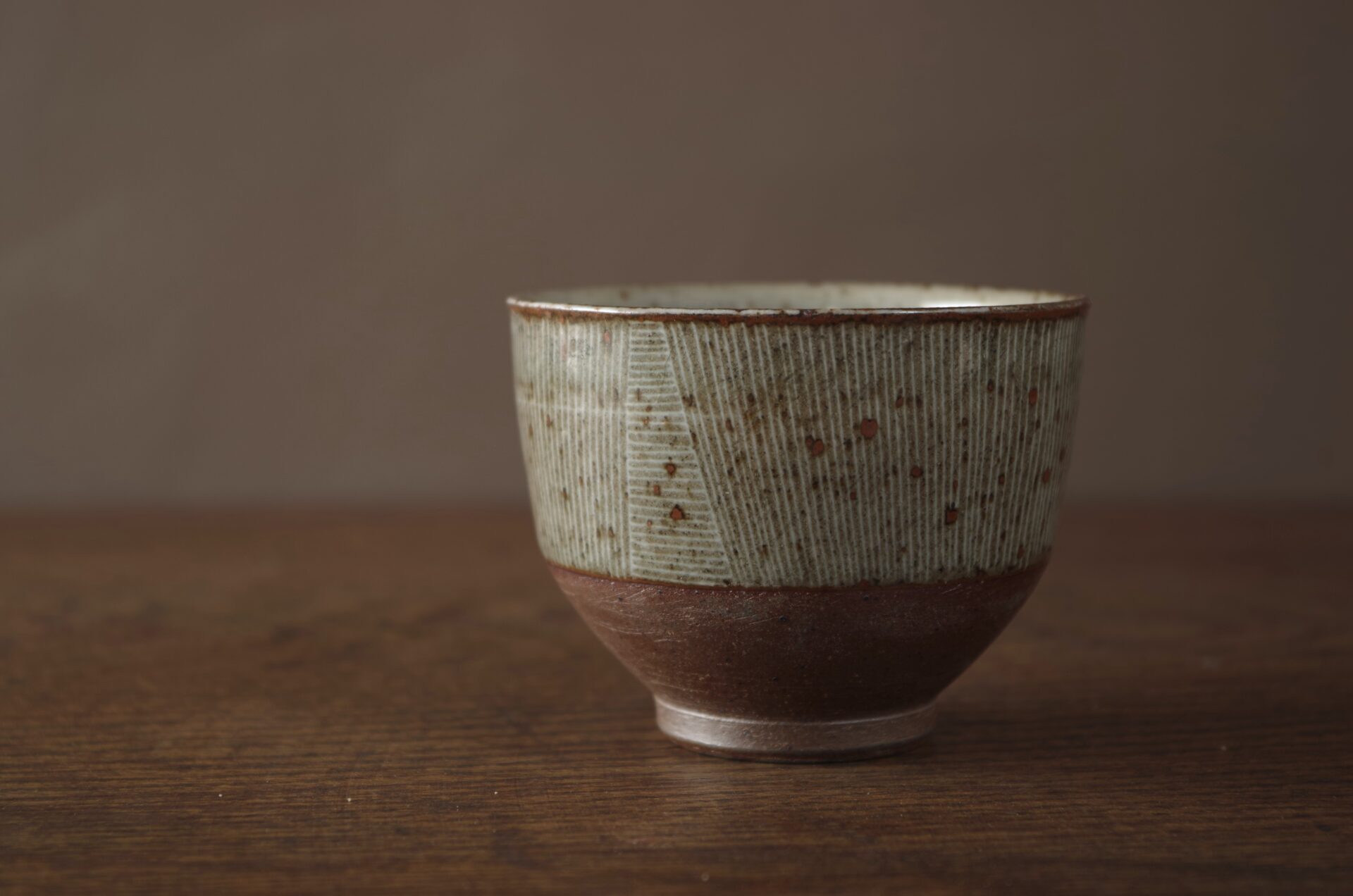 Thrown dark stoneware tea bowl with inlaid decoration.