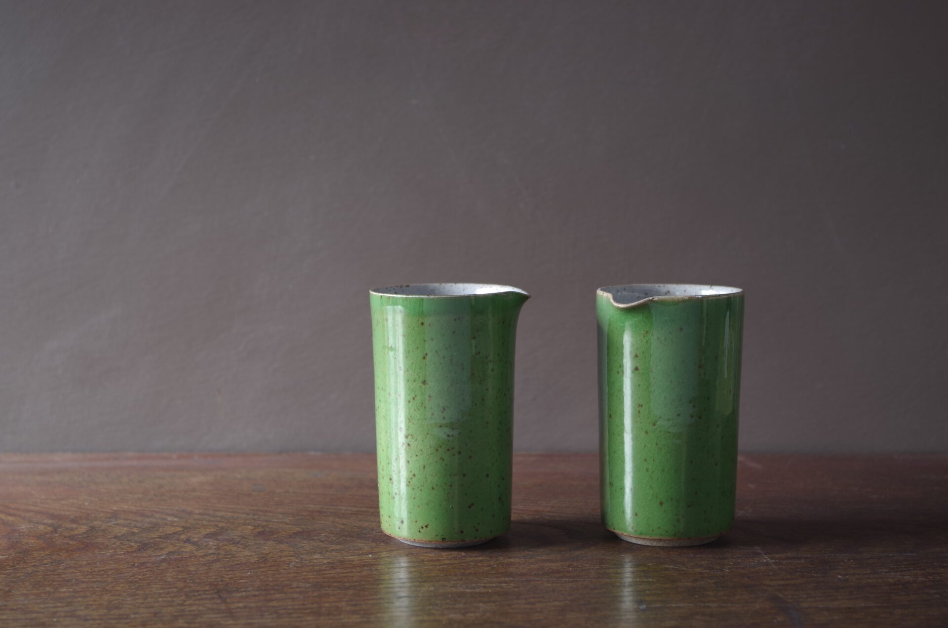 Thrown stoneware pourer with green glaze.