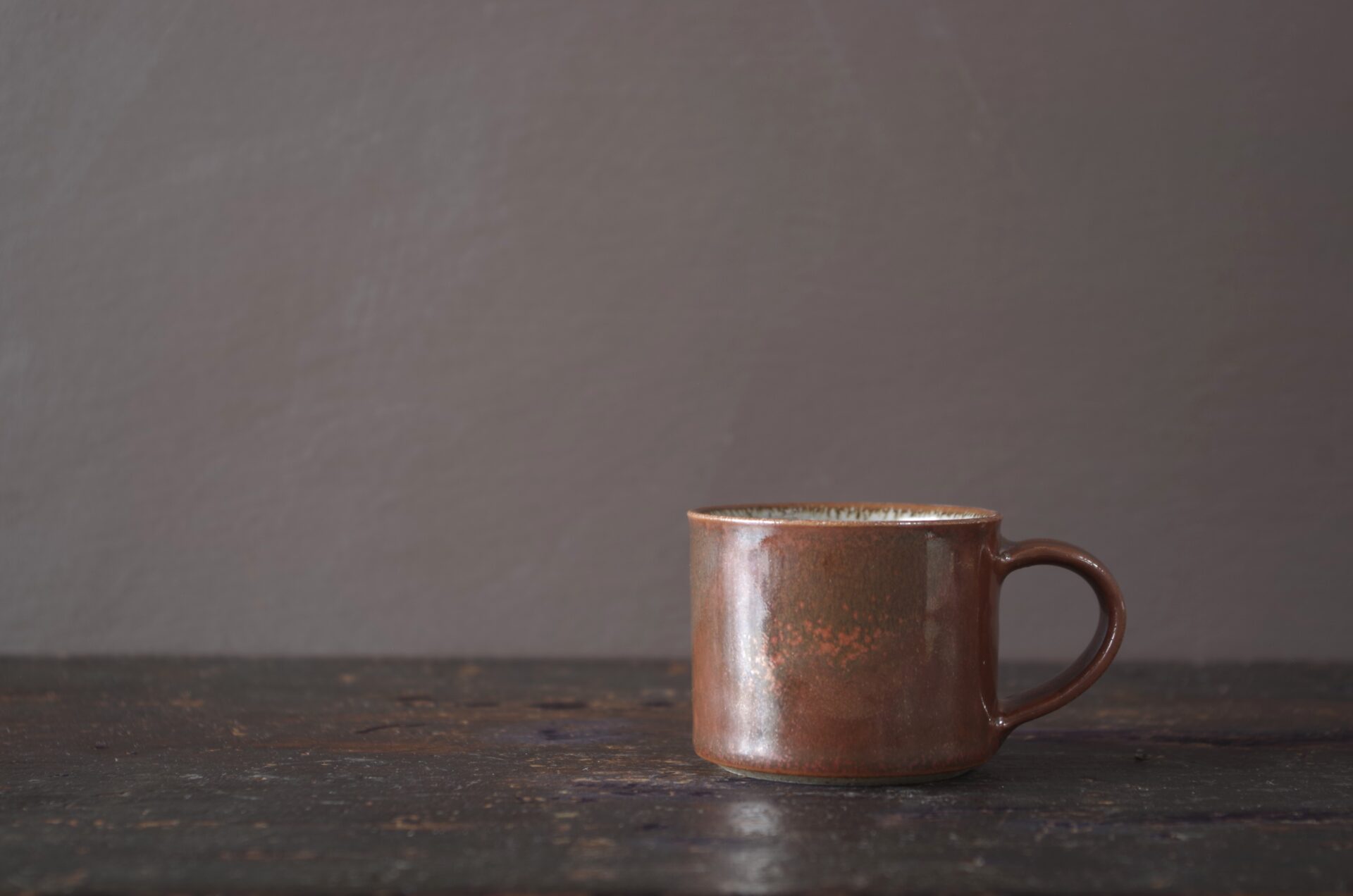Thrown stoneware espresso cup with pulled handle and persimmon glaze.