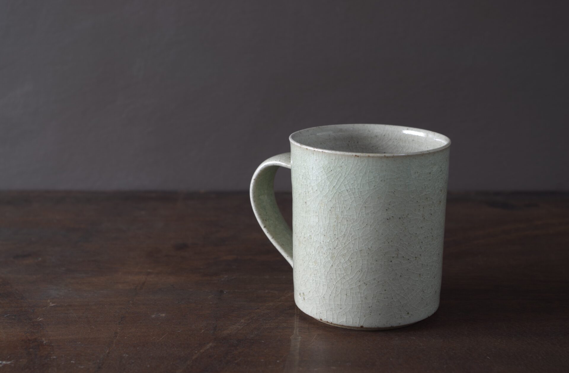 Thrown stoneware mug with pulled handle. Pale green transparent crackle glaze.