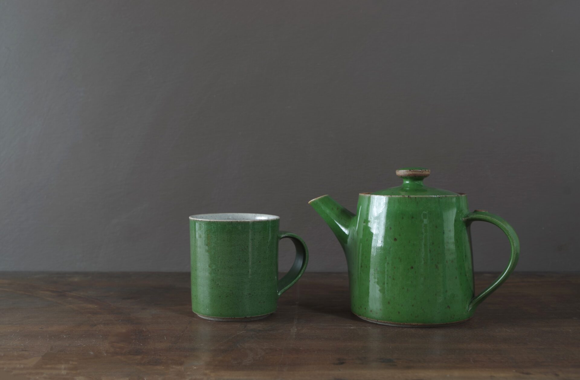 Thrown stoneware mug with pulled handle. Green glaze.