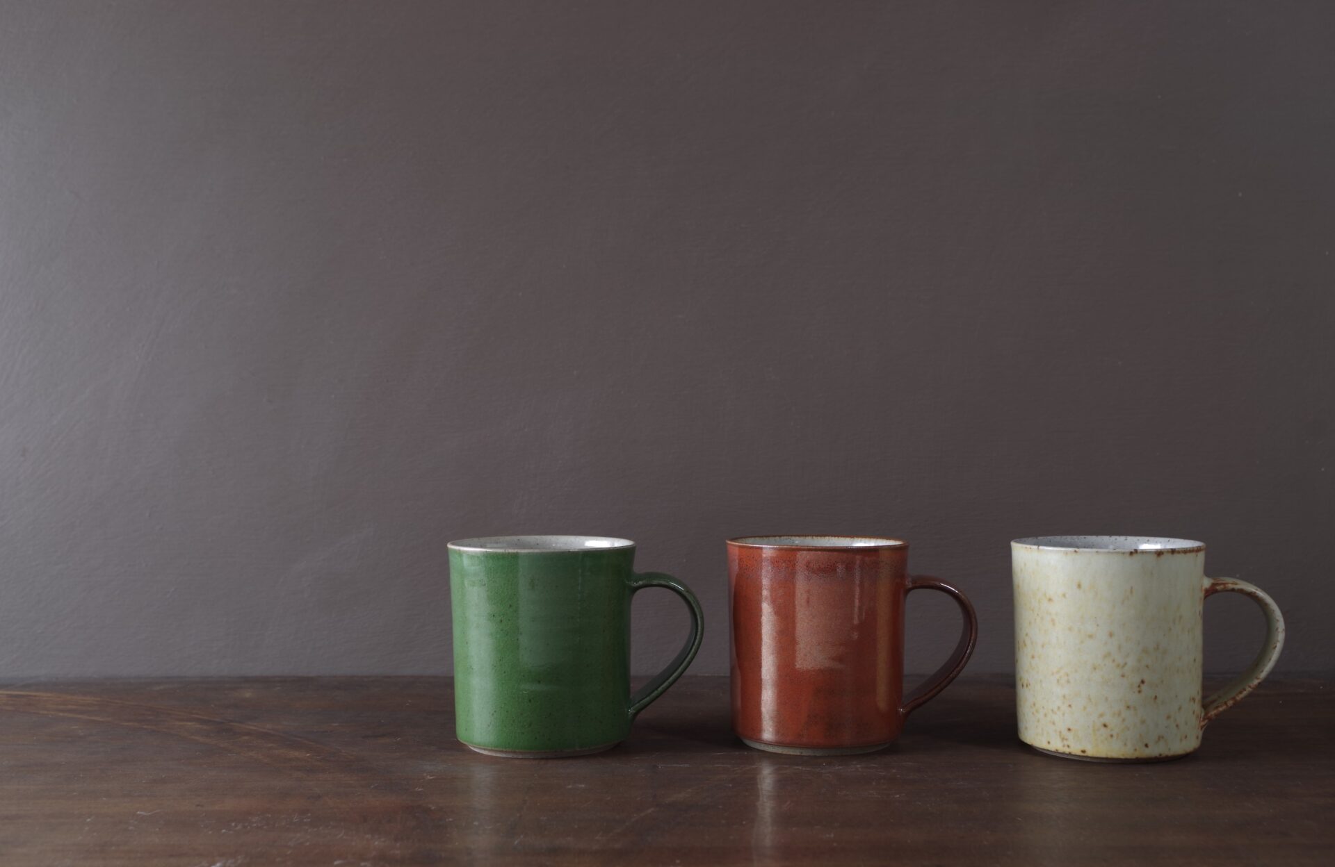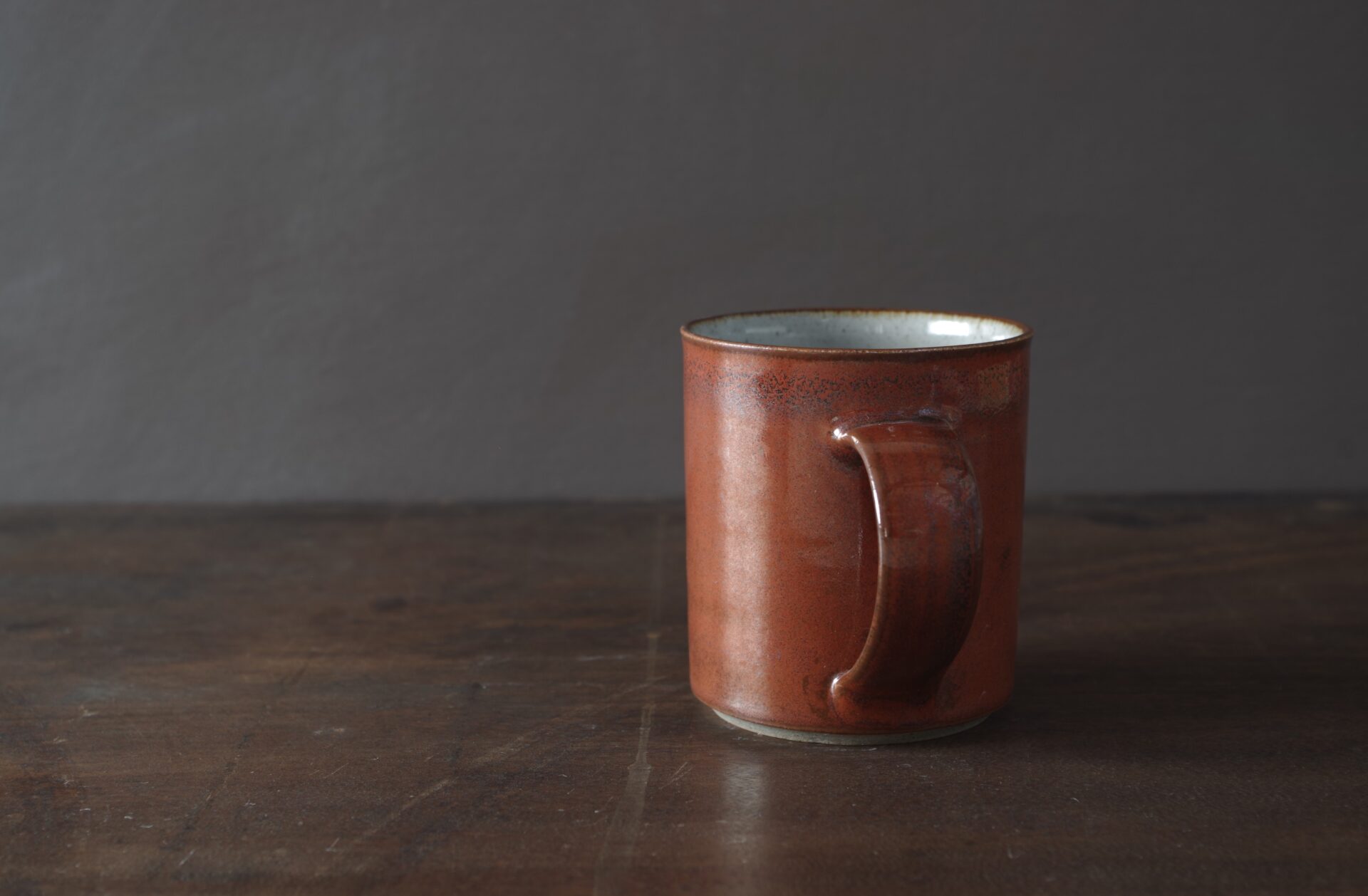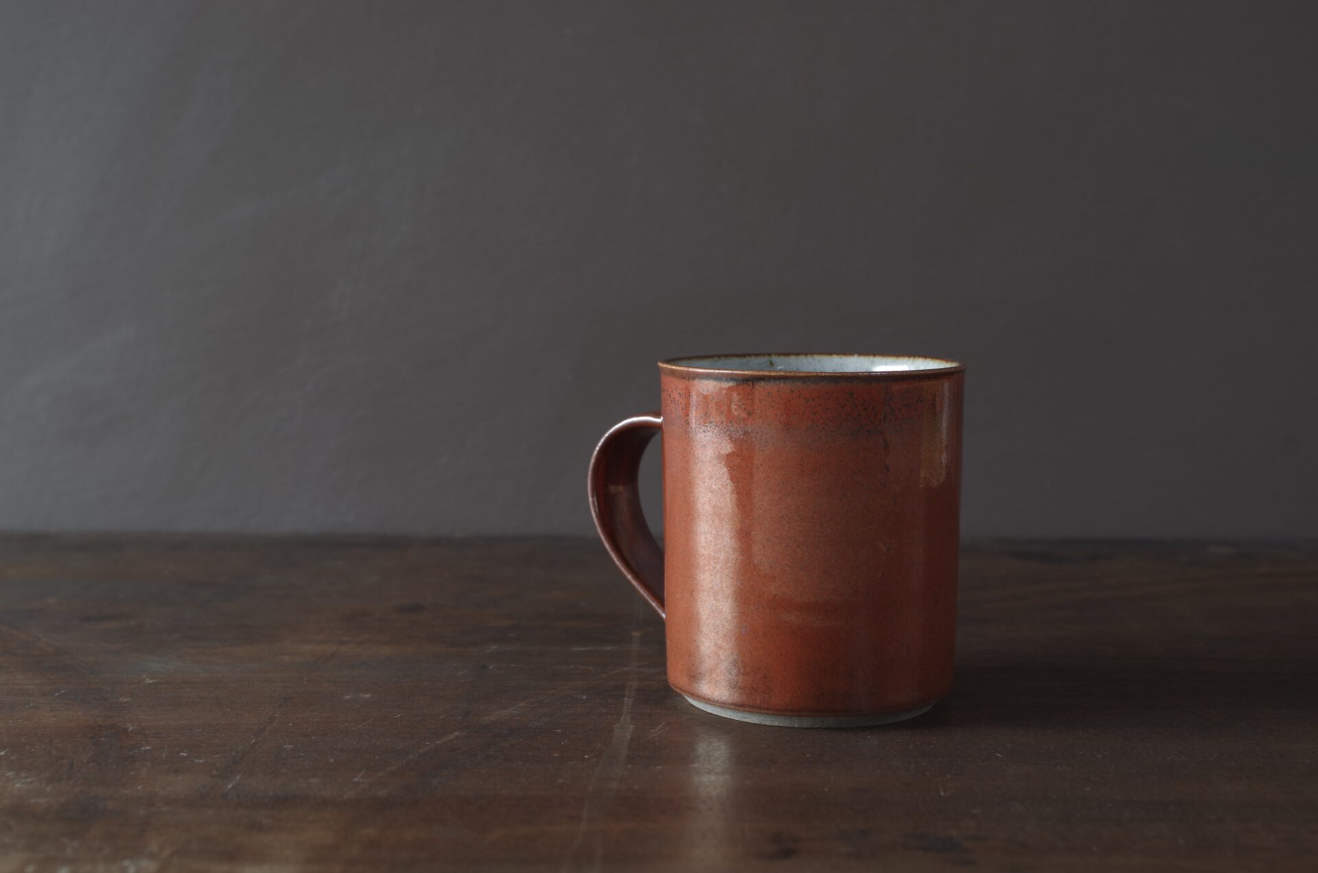 Thrown stoneware mug with pulled handle.Persimmon glaze outside, clear inside.