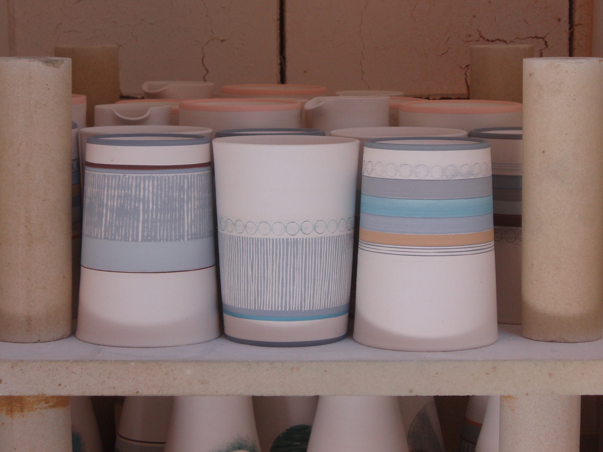 Decorated beakers waiting to be biscuit fired. I love the way pots can be crammed into a biscuit firing.